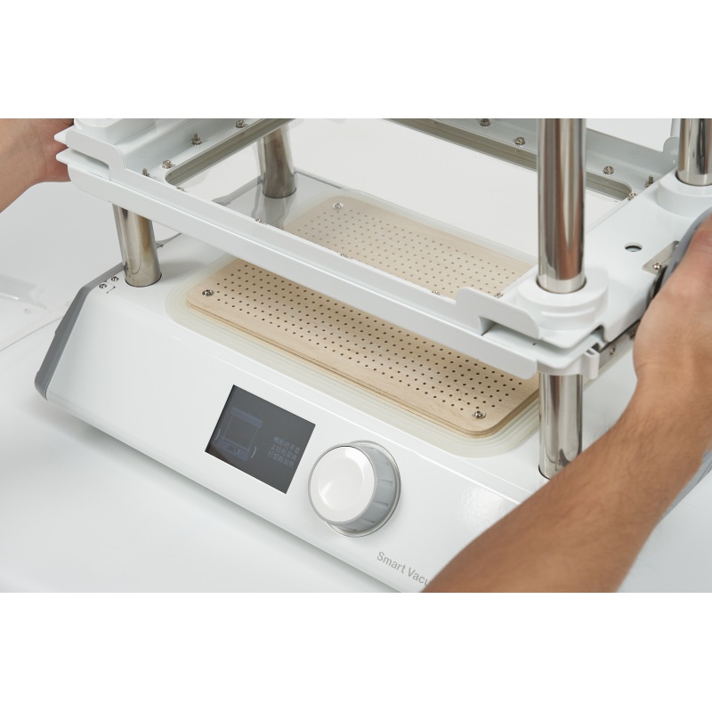 The built-in industrial-grade AC induction pump delivers a powerful -90 kPa suction force, ensuring sharp and detailed moulds. The CNC wooden forming bed minimizes heat absorption, improving consistency and accuracy.